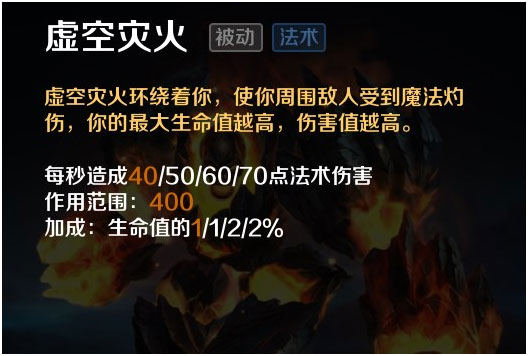 3、技能3虚空灾火:虚空灾火,地狱火核心技能,血量越高伤害越高,配合坦克的定位,对于地狱火来说有这无与伦比的性价比,在点完1技能后尽快将其点满。