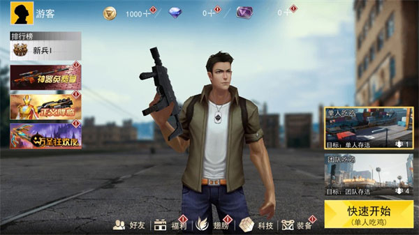1、进入吃鸡荣耀精英游戏的主页面,选择“快速开始”;