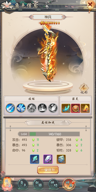 3、神兵也可用过使用不同级别的器灵获得更多的属性加成;