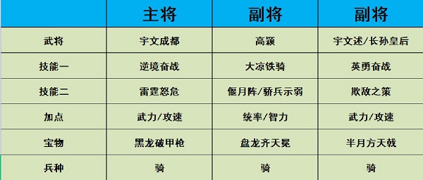 爆头骑主要依赖宇文成都和高颖,宇文成都有高概率锁定对面主将,高颖则提供主将2回合的免控和50%减伤,因此主要资源用来培养宇文成都。也因为这个队伍没有续航能力,打架全依赖锁头机制,则需要很高的技能配置才有威力,所以前期特别拉胯,选择玩的话需要摆烂半个月,半个月后随着养度提升,则慢慢可以和三李过招,直到满配后的胜率37开。而另外一个副将选择宇文述长孙皇后都可以,都是为了提高先手状态,我觉得长孙皇后更佳,更契合爆头队。