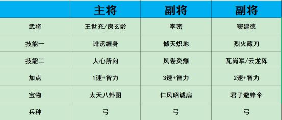 折冲军因为至少3周才能出来,这时候的李世民可以带急智谩敌,加点为统率做副将,李靖做主将进行主力输出。大军压境获取难度也高,平民一般一个月才能获得,所以前期可使用浴血奋战替代。兵种在没有上折冲军之前,可以随便切换盾枪,上了折冲之后就固定盾兵。另外在李世民没有6星或者没有折冲之前,其实是可以使用高颖或长孙皇后对李世民进行替代的,PVP能力可能更强。