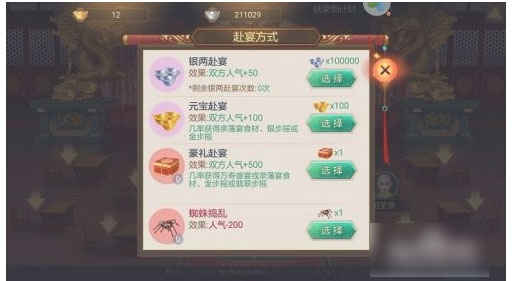 第八步:弹出“赴宴方式”对话框,我们可以根据自己的财力选择赴宴方式。
