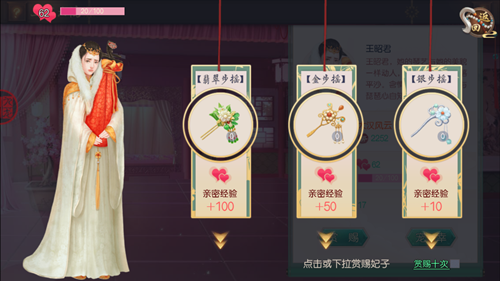 一、后宫步摇等孩子到65个后再用,先买特惠礼包中的杂货礼包,把寻访能迎娶的妃子全部迎娶。孩子满65个后赏赐步摇要注意:除王昭君、杨玉环外的所有妃子亲密度培养到20解锁20亲密度势力技能即可,其余步摇全部平均分配给王昭君和杨玉环。