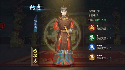 每个大臣也都会对自己有一段介绍,通过这些介绍就可以大致分析出他们的特长了。同品质的总资质点数是一样的,所以大家完全不用担心在三个里面选了差的问题,只要选择自己目前需要的就好。