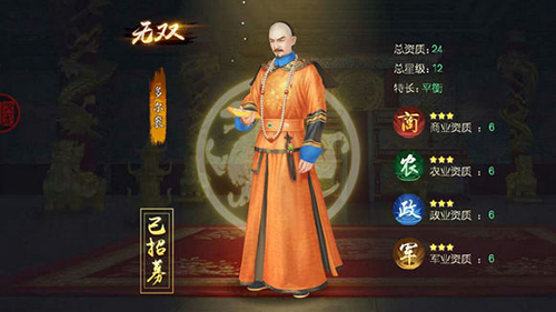 无双大臣除去要氪金的,剩下有4个,最好的应该是林则徐(军事商业),然后是多尔衮(平衡6-6-6-6)包龙星(商业政治),最后的是郑成功(政治军事)