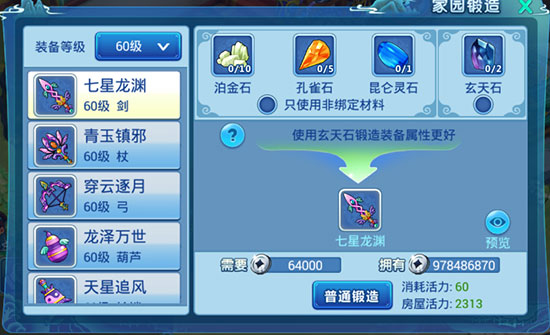 打造装备,首先是材料的采集,人物达到60级之后,帮派内生活技能则可以升到6级,野外资源堆相对比较少,且采集的人较多,要采集到较多的材料就需要用到家园系统了,使用功能型家具:尧帝百宝袋(用于生成资源堆,使用条件:舒适度220,人物等级40级),家园采集相对野外采集获得稀有材料的概率也会大的多。