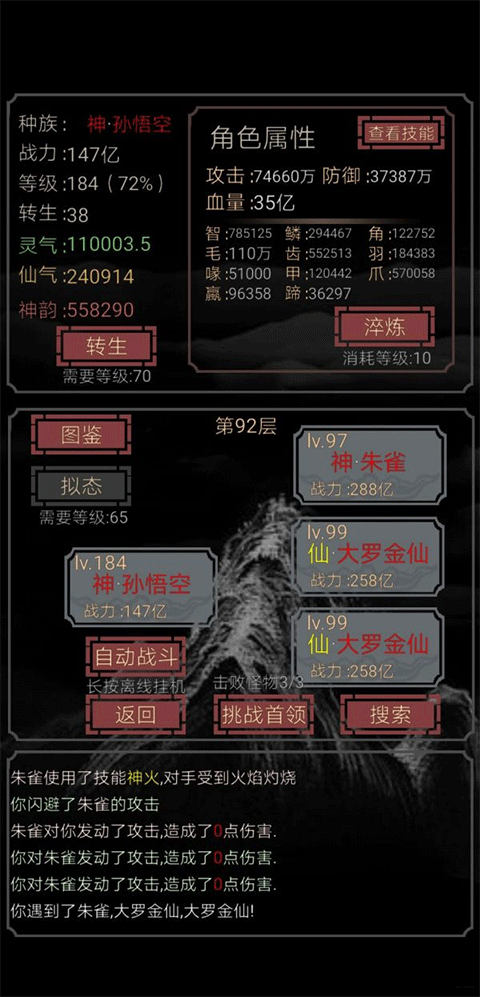 玩法核心就是平头哥的战意,真龙血脉,龙脉,一个回血技能,其他全部学闪避和不让敌人打你的技能,可以学个变化,任何种族都可以通关,孙悟空是用真人打出来的。