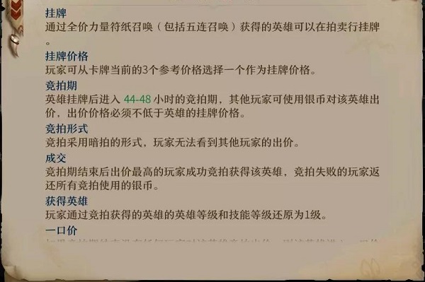 1、只有通过全价力量符纸召唤获得的英雄才可以在拍卖行挂牌出售;