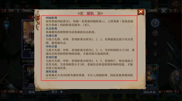 英雄距离计算规则和先锋、中位、首领的位置,可以在部队界面了解到。在各个英雄资料界面,系统会根据英雄的职业(战法师、坦克、诡术师等),推荐英雄的站位。