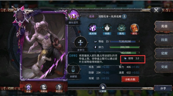 英雄的上阵受到“领导值”的限制,提升主城等级可以增加领导值上限,我们会在领导值7.5—8.5度过较长的时间,在配置阵容时优先考虑领导值在3.5以下的英雄进行培养。
