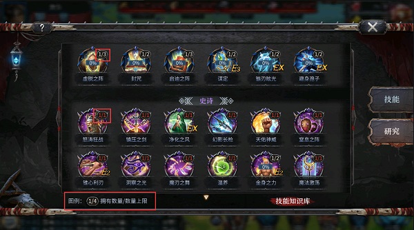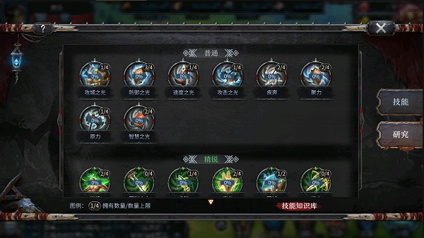 研究技能需要使用英雄作为研究素材,相当讲究缘分。每个技能研究的数量是有限的,一般来说品质越高的技能,数量上限就越小,技能种类非常多,有着控制、治疗、输出、属性等不同方向,非常全面。