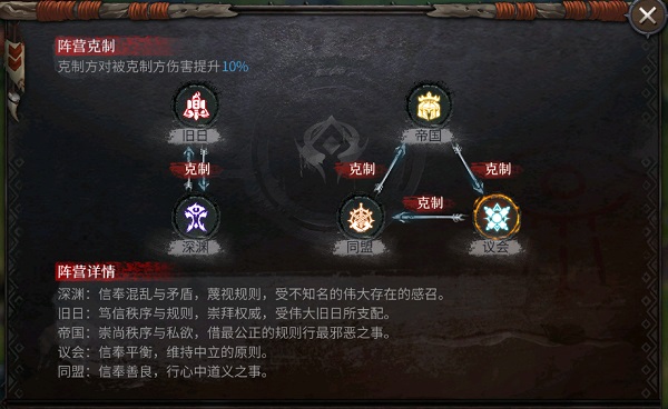 英雄们隶属于不同的阵营中,在英雄界面左下角的“阵营处”即可知道该英雄所处的阵营,阵营之间存在克制关系。