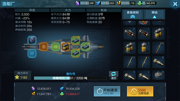 3、解锁研究丰富的武器装备,自由搭配到舰船上,组建最强海上编队。