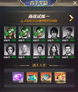 每章商战试炼,玩家需要击败多个BOSS才能通关,击败每个BOSS均可获得试炼币,首次击败会有额外奖励,全部击败后通关一章试炼,更可获得钻石、人才卡等珍稀奖励,同时会自动解锁下一关卡。试炼币可用来兑换奖励道具。