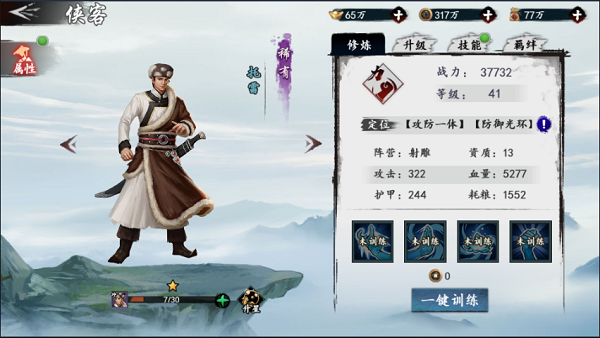 玩家首先点击任意侠客进入到的界面是侠客的属性展示界面,界面里又分为侠客修炼、侠客升级、侠客技能、侠客羁绊四个功能。同时还有侠客的升星功能。