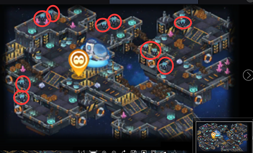 不过,激活房间需要使用芯片。我们可以根据剧情任务提醒,收集地图上面会出现的芯片。按照上面介绍的偷懒方法,收集7个芯片就可以了。下图是可以采集到芯片的大概区域,由于本次小地图打开分为了三个区域,所以有点小,为了让大家看清楚采集区域,特意放大了图,所以有些糊了。