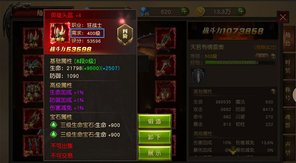 点击装备,显示装备属性界面。包括职业需求、等级需求、星级、等阶、装备战斗力数值以及各种附加属性。