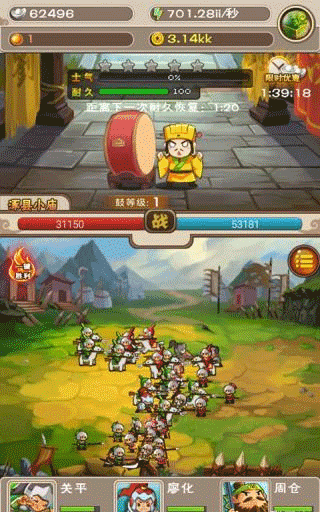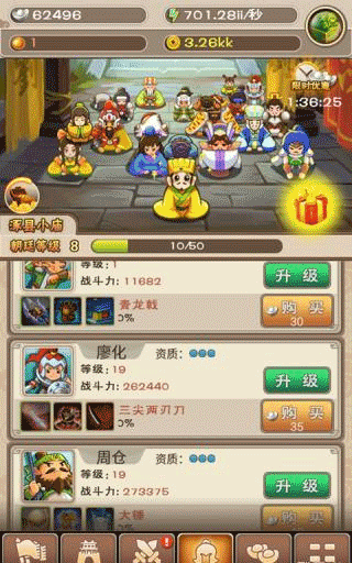 游戏的操作相对简单,新手也能快速上手。通过升级大臣、战斗胜利或挂机等方式获取金币,可以解锁更多高级功能和装备强化。武将系统也很丰富,每个武将都有独特的技能和属性加成,合理搭配能提升战斗力。
