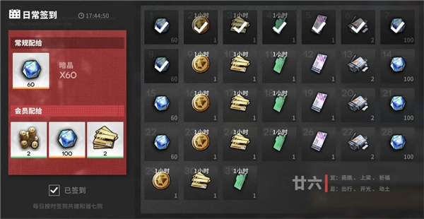 ②日常签到:60*4+100*4=640暗晶+4张甄选协议≈7抽;