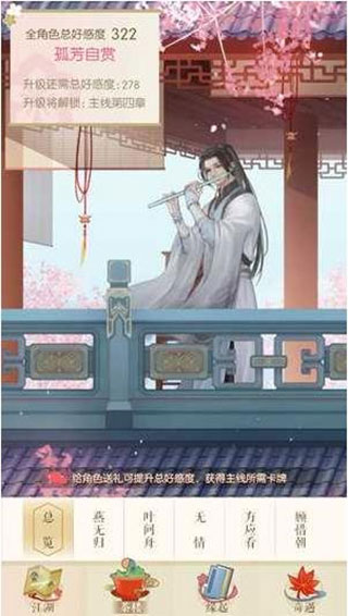 江湖就是游戏的主线,茶楼则是玩家同主角建立心动值的地方,玩家通过游历获得物品,然后赠送给自己心仪的角色就可以增加好感度,从而开启和他的浪漫故事。游历还能获得一些奇遇,比如美景,书信等,都可以在奇遇界面查看到。