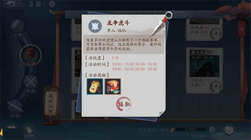 龙争虎斗活动可以获得大量的江湖令牌,但是只有在每天特定的时候才能进入,在11.30、14、30、17.30、20.30、22.30、24.30,每次都能持续半个小时。具体的进入方法是打开活动界面,接取“龙争虎斗”,然后就能传送到副本参加活动啦。在大厅中四个入口都能进入第一层,但是选择同样有时间限制,30秒内未选择会被请出大厅。