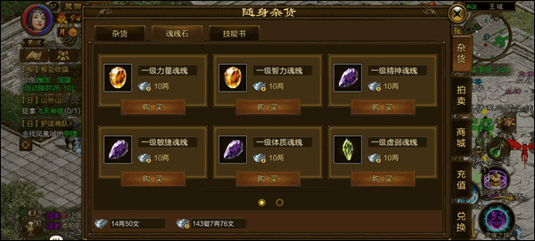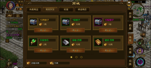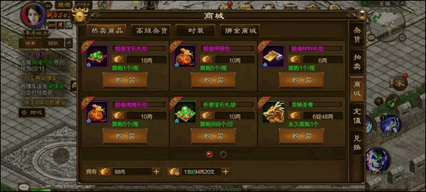 商城有出售升级宝石、硬皮、秘银,只要花费金子就能购买,也可在绑金商店使用绑定金子购买秘银、硬皮。每周商城还会退出限购礼包,可根据自己的策略购买礼包哦!