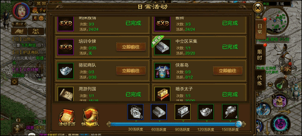 日常活动中有各种日常任务,中立区采集可以获得硬皮、秘银,周游列国奖励藏宝图有几率挖到硬皮、秘银,暗杀太子则可获得魂魄石,BOSS猎杀可获得秘银、硬皮、升级宝石。日常任务奖励的宝箱开启也有概率获得硬皮、秘银、魂魄石。完成日常任务会增加活跃度,达到一定活跃度即可领取秘银、硬皮、魂魄石、升级宝石奖励,日常任务每天一定要完成。
