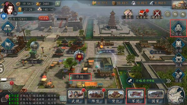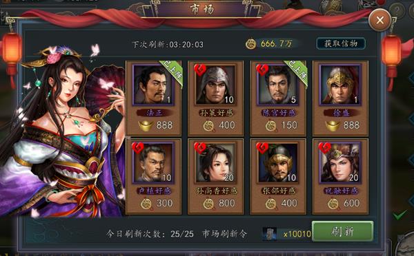 市场:市场属于主城内的固定建筑,当大殿等级达到3级时,水镜先生就会为主公们解锁市场。主公们可以通过消耗信物来换取武将好感度,当好感度到达一定程度时,该武将就会投靠主公。同时,一些与主公有缘的人才将允许各位主公花费元宝直接将其收归帐下。