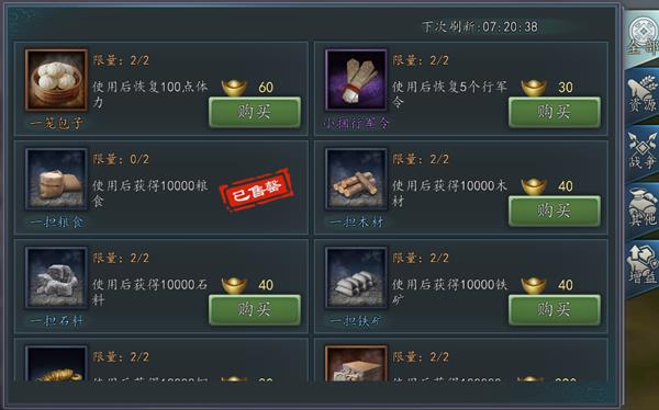 商城:商城内每日可购买道具的价格和数量固定,商城中所有的道具都只能使用元宝购买,其中道具主要分为4类:资源类、战争类、增益类和其他。由于三国时期资源紧缺,因此资源道具每日购买次数是有限的,而战争类的道具则不限制购买次数。