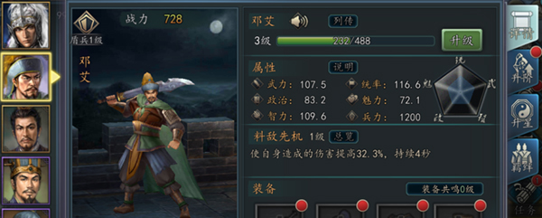 同时,武将们都可以用进阶的方式来提升属性,在剧情中可以获得各种各样的材料,用它们能提升武将武力,智力,统率,带兵数等一系列属性,当武将完成某一阶段的进阶之后,还能获得额外的属性奖励。由于初期材料有限,所以最好把它们优先给主力武将。
