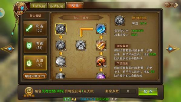 智力通用道理和敏捷通用雷同,本应38点,点数不够,只加了30点。这里是一道选择题:想练级快些、打BOSS快些,就优先通用38点;想PK厉害些,就优先出复活术、凌风狂攻