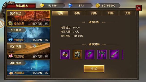 目前游戏中总计会开放4个组队副本,分别掉落对应的道具。每个副本都有初级,中级,高级,特级和大师5个难度。完成越高难度的副本,获得的奖励也越好。同时,越高难度的副本等级要求也越高。每个组队副本每日只可完成2次。