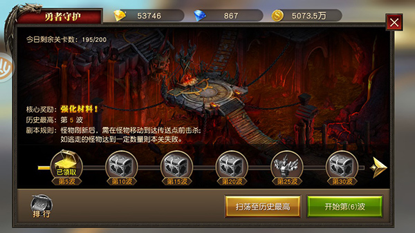 从第二天开始,玩家可以直接使用扫荡功能,直接完成从第一波到已完成的最高波次关卡,直接获得奖励,然后继续挑战之后的关卡,十分便捷。因此玩家提升战力后,都可以前往勇者守护进行挑战。