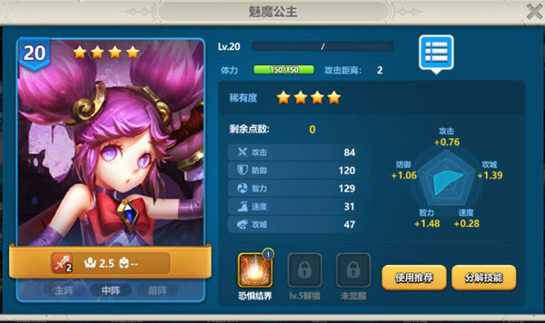 4星魅魔公主统领值同样不算太高,智力属性较为出色,关键是其自带技能【恐惧结界】可以提供高额的魔法伤害。在极度缺乏核心输出英雄时,该英雄值得培养。