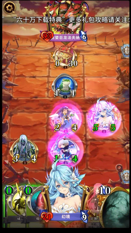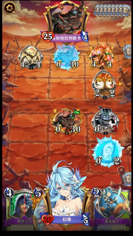 不过还好,女神前期没什么高攻卡,这里推荐用人鱼,前期采用防守战术,让第一个扭蛋孵化铺满全场堵住位置,用城墙冰冻封印变形来拖时间直到其他扭蛋孵化,扭蛋没了就没什么难度了,把手牌用光,避免被炸血,毕竟到这时候玩家血也不多了。下面是效果图: