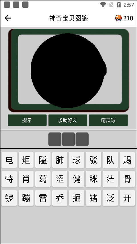 3、用户需要在下面有24个字中选出精灵的名字,左上角的神奇宝贝球开局只有两百个,每过十分钟就会送10个神奇宝贝球。神奇宝贝球是用来提示用的,每提示一个字就需要十个神奇宝贝球。