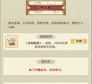传功房内可以查看本门派是否能学习炼丹,炼器,阵法,有无门派秘籍。一般来说有秘籍的门派才值得在内常驻,如果当前门派全部毕业,建议选择有炼丹术的门派挂丹方。