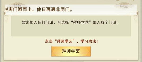 当没有门派时,玩家会处于“散修”状态,点击“拜师学艺”即可根据自己的修为随机刷进各大门派之中。