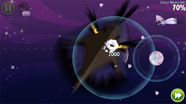 太空爆弹鸟(原黑色的炸弹鸟)是深藏不露的高手,可是一旦发威,就会一鸣惊人!知道这是什么意思了吧,是的,这种愤怒的小鸟可以爆炸!你只需要在恰当的时机轻触屏幕,小鸟就会像地雷一般爆炸!攻击范围和力度都是相当可怕的。所以你一定得在该爆炸的时候才能让它爆,稍不注意,可能就会错过最佳良机!这种愤怒的小鸟什么都能毁坏,所以好钢一定要用在刀刃上,最优先选择炸混凝土结构!