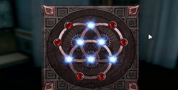 我们再来看看宝石转盘,右上角的箭头按钮“点击1下”,最下方的箭头按钮“点击2下”就可以完成其中一个宝石转盘。我们最终目标让所有蓝宝石汇集在中央,这样就能达成目标。