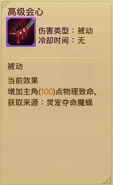 获得后可通过高级还童丹刷出「会心」技能,并通过技能摘取,学习到出战灵宠上。