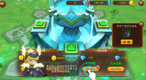 一、当等级达到相应条件,许愿池系统就会自动开启,可以看到共分为金币许愿和钻石许愿两种模式,十连抽的话还有九折优惠。作为我们后期装备、材料的主要生产地,大家要多研究一下,如果有数学大神能够研究出高概率的技巧,记得分享一下哦。