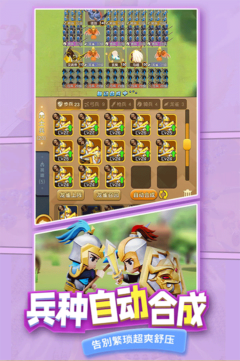 迷你军团是一款Q萌三国风的放置合成手游,在游戏中玩家可以看到一个复古风格的游戏世界,以真实的三国历史为背景搭建,让玩家感受真实的三国生活。