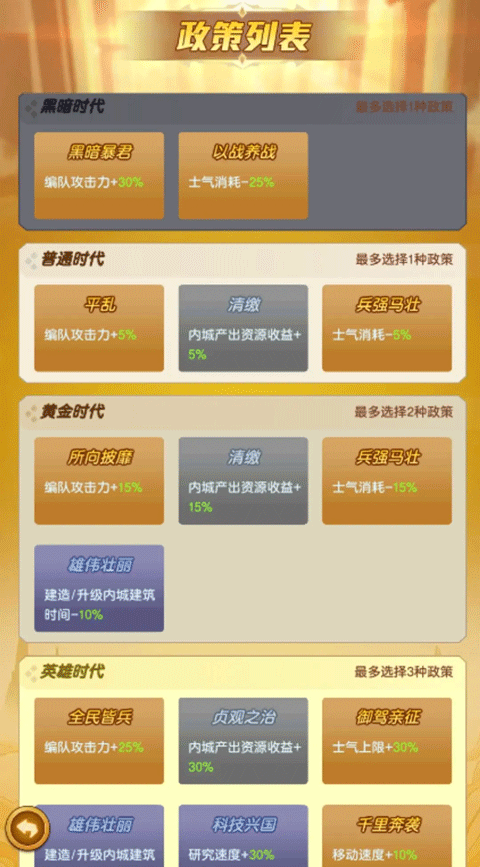 不同时代拥有不同的时代政策,可以提供不同的加成