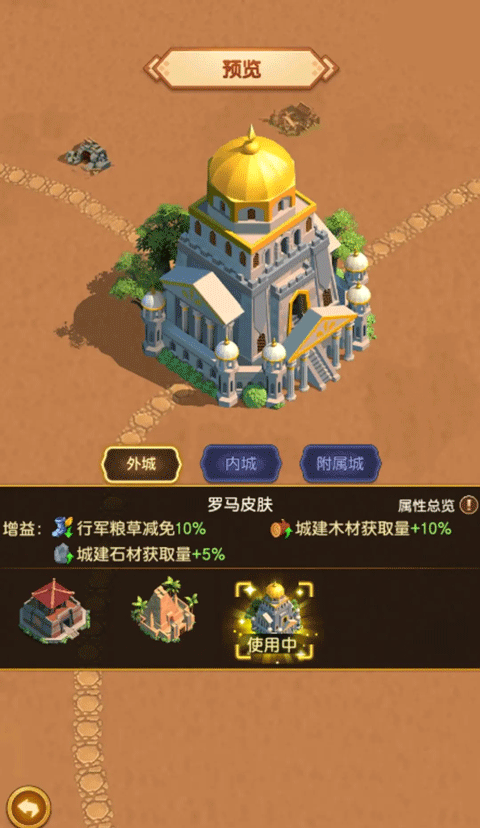 目前游戏内有埃及皮肤和罗马皮肤二个城池皮肤,可以通过特定的活动获得