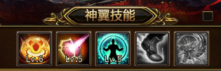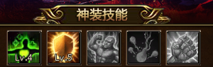 神装一共具有5个技能,分别在神装达到2阶、3阶、4阶、8阶、10阶时自动激活。升级神装技能需要使用神装技能训练书道具。