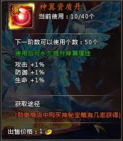 (1)神翼可以喂食资质丹,资质丹可以按百分比增加神翼的进阶属性;