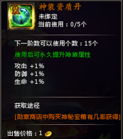 (1)神装可以喂食资质丹,资质丹可以按百分比增加神装的进阶属性;