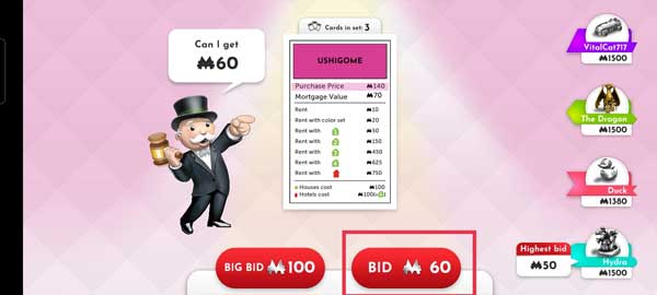 7、当玩家开始进行拍卖时,每次加价至少是要加1块钱,价高者得。当拍卖结束后再次开始掷骰子开始下一轮。