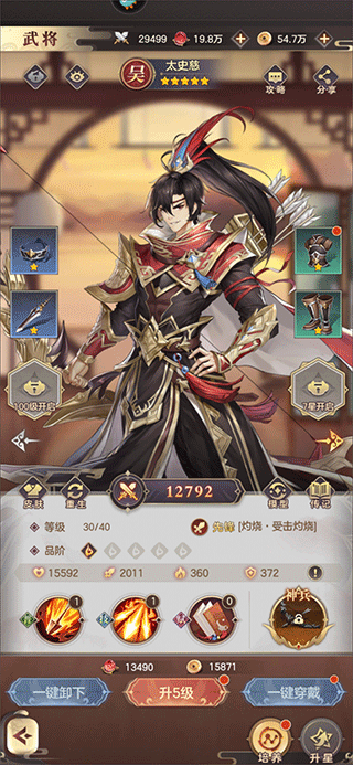 3、通过给武将升级、穿戴装备,可以使武将的战斗、血量、防御属性的提升